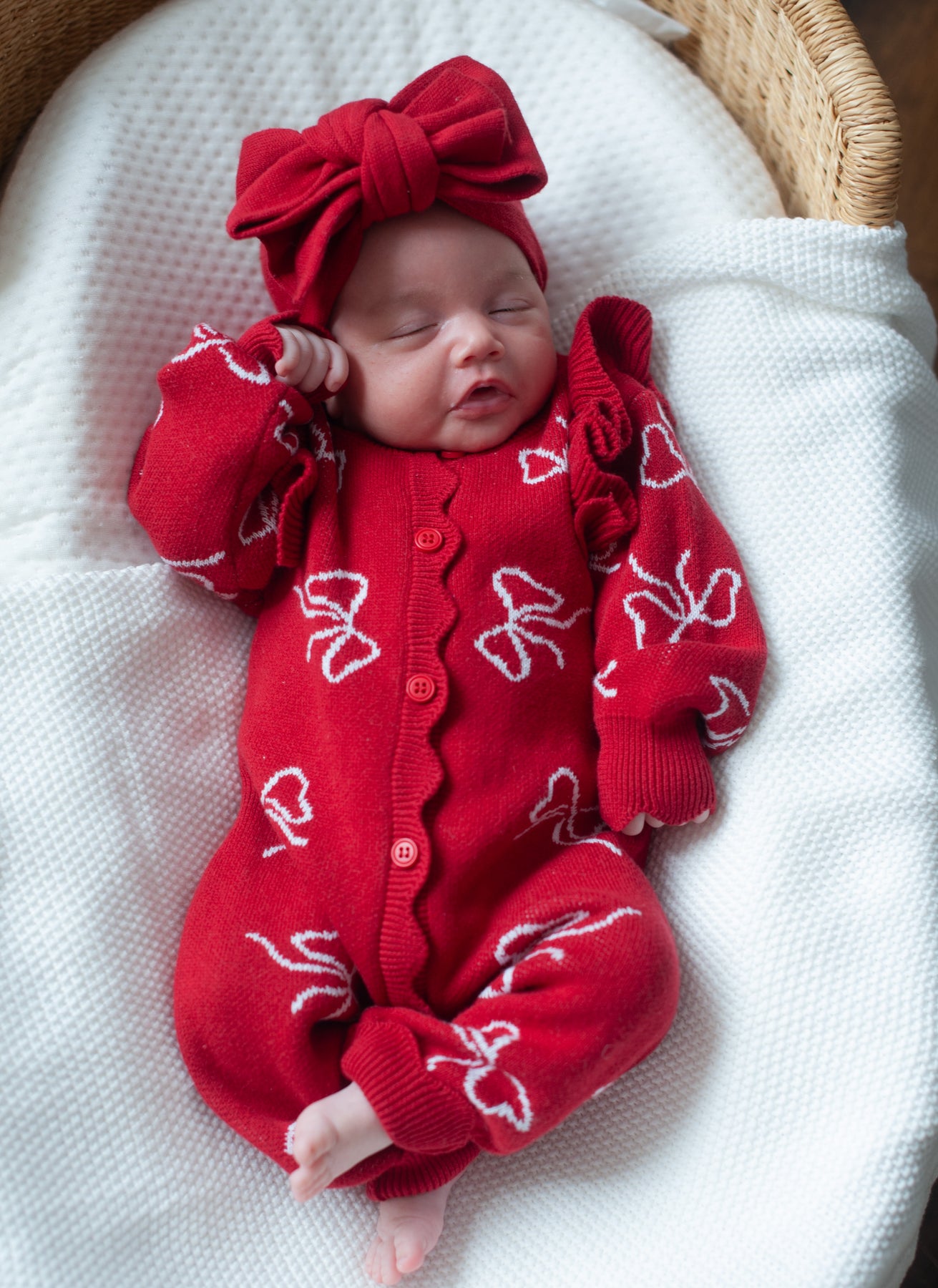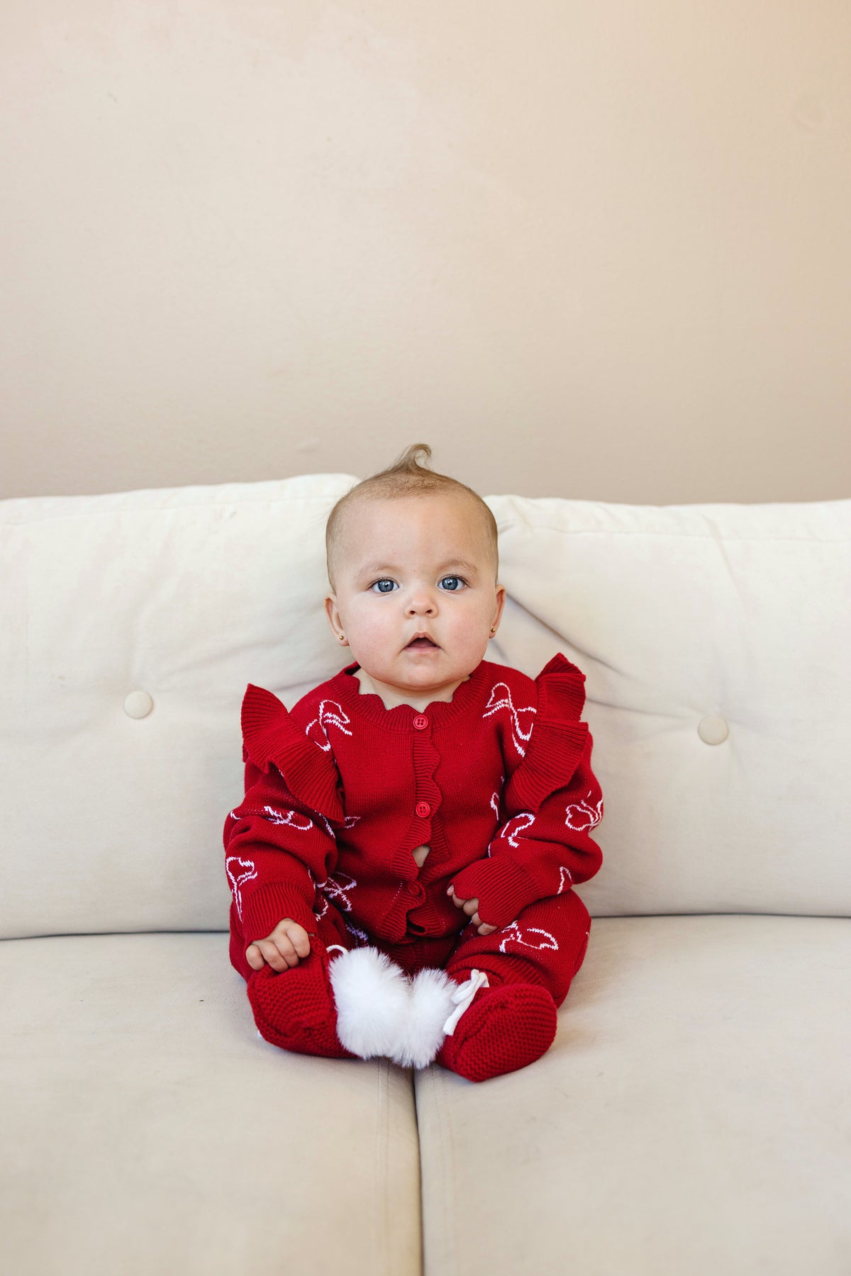 A beautiful knitted romper in Santa red Christmas Check, designed with comfort in mind. Pair with our matching knit beanies & booties. Functional snaps at crotch for easy nappy changes.