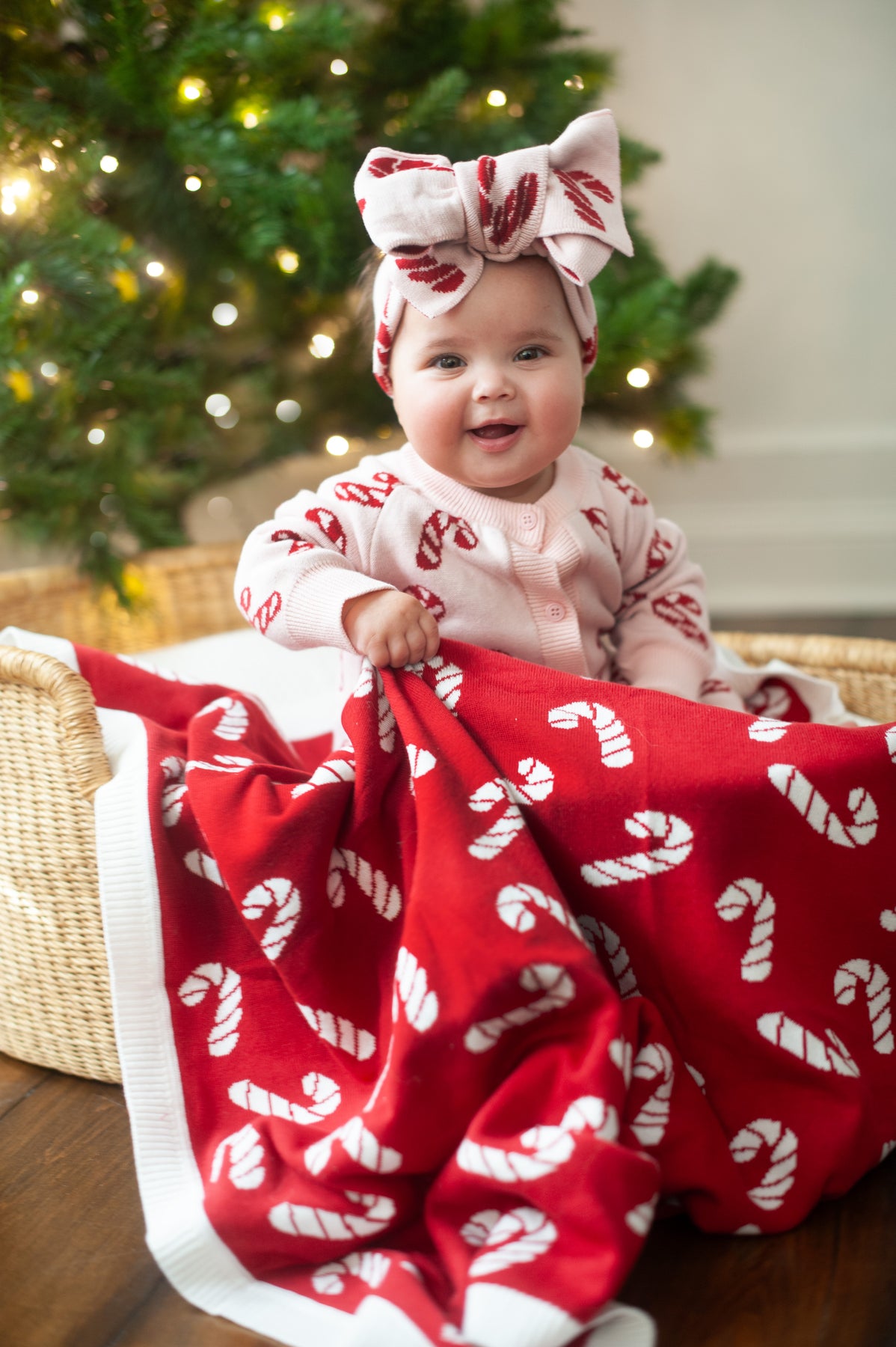 Wrap your little one with our Knit Blanket in Classic Candy Cane.  Made from 100% breathable cotton, it’s gentle on delicate skin and perfectly sized for snuggles, stroller rides, or quiet time in the nursery. Whether you’re celebrating a first Christmas or simply love a classic design, this blanket is a keepsake to cherish.