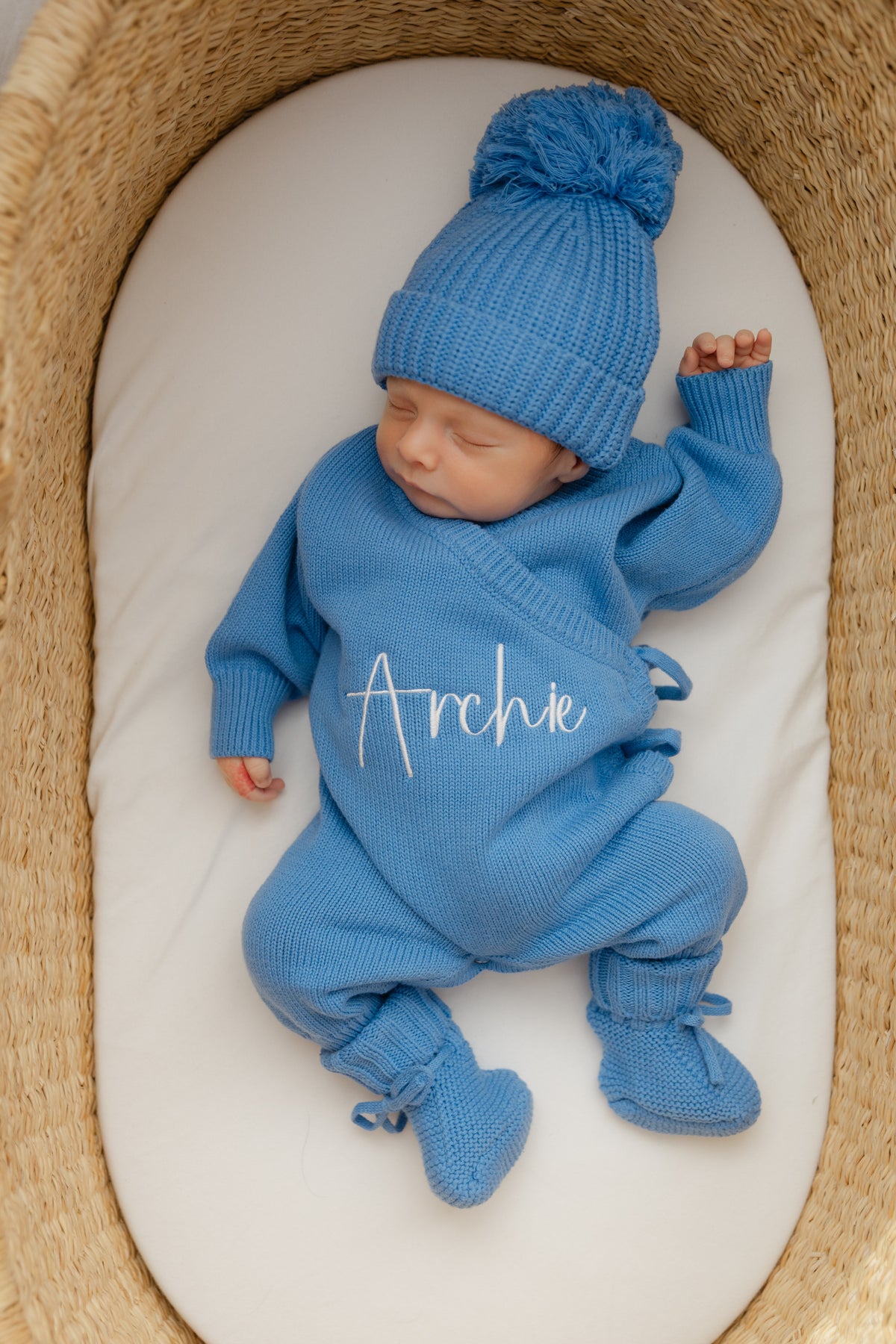 Finished with a personalized embroidered name detail, this one-piece is perfect for newborn photos, special moments, or everyday snuggles. Thoughtfully designed snaps at the legs make diaper changes quick and fuss-free.