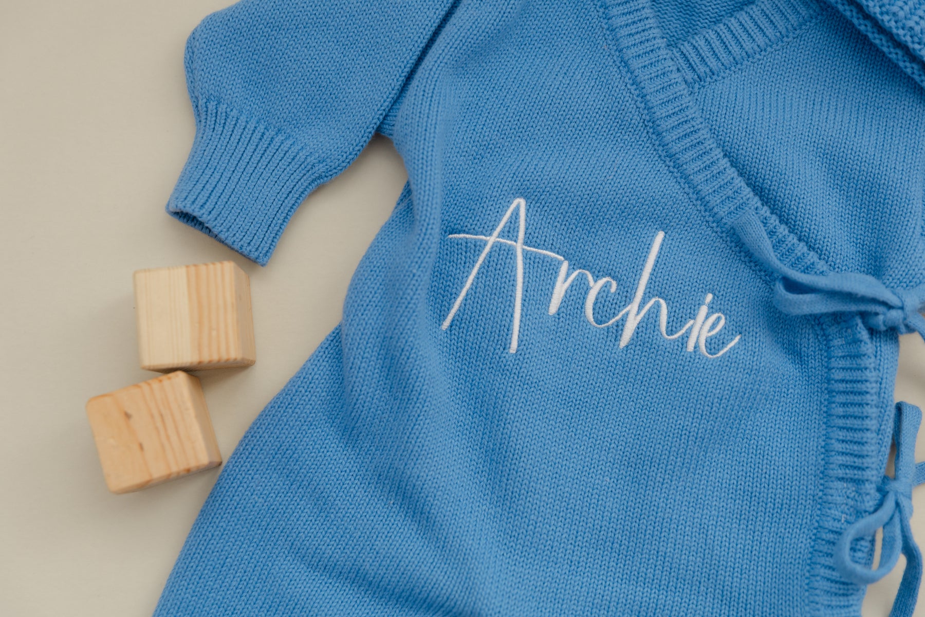 Sweet, soft, and effortlessly timeless. Our Cornflower Blue Knit Romper is crafted from a cozy, breathable knit designed with baby’s comfort in mind. The wrap-style silhouette ties gently at the side for easy dressing, while the delicate ribbed cuffs and soft pink hue add a classic, heirloom feel.